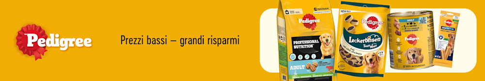 L'alimento umido in lattina è disponibile in diversi prodotti, ricche di carni pregiate, e formati: da 400 g e 800 g, anche in multipack convenienza da 12x! La gamma di snack comprende i famosissimi Dentastix, bastoncini per l'igiene orale in diverse misure, e molti altri snack!- Crocchette per cani Pedigree: l'assortimento di alimenti secchi Pedigree per cani comprende due varianti per cuccioli e cani in fase di crescita di taglia media e grande, a base di carne di pollo e riso. Per cani adulti vi sono diverse ricette, tra cui quella con 5 tipi di carni e quella per cani adulti di taglia grande (>25kg), con pregiata carne di manzo e verdura.