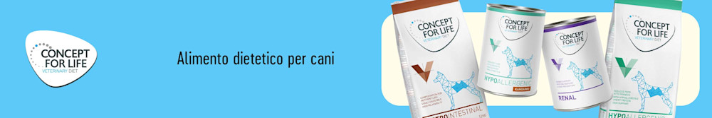 Concept for Life Veterinary Diet è una linea di alimenti dietetici. crocchette e umido in scatoletta, completi che possono fornire supporto nutrizionale ai cani con determinati disturbi. Somministrare l’alimento dietetico solo dopo aver consultato il proprio veterinario di fiducia. Consultare il medico veterinario prima di decidere se estendere il periodo di somministrazione. In caso di peggioramento dello stato di salute dell’animale, rivolgersi immediatamente al medico veterinario. Inserendo nel carrello il prodotto dietetico selezionato, confermi di aver letto e compreso le avvertenze sopra elencate. 10% di sconto per il mese di settembre sui prodotti Concept for Life